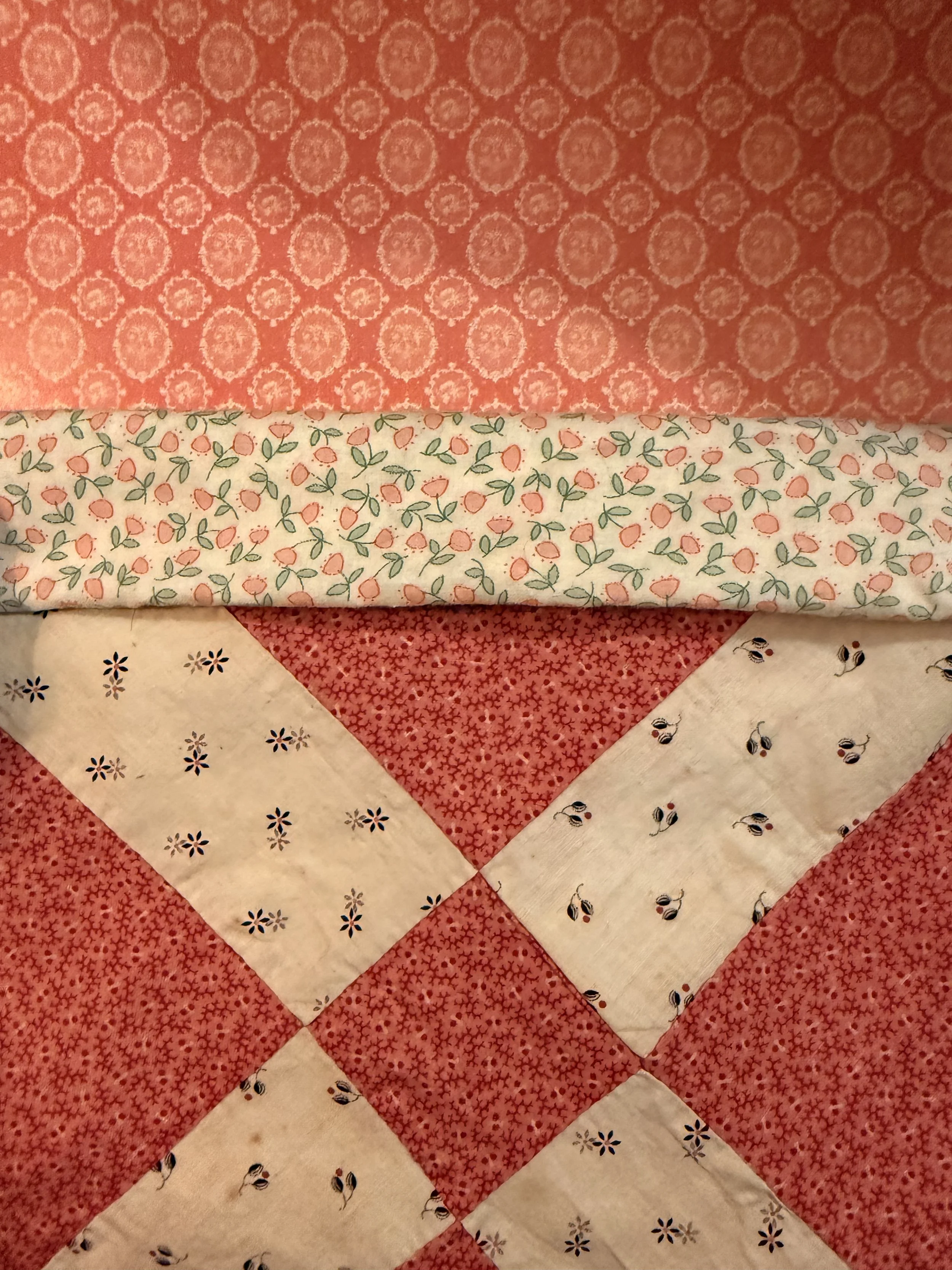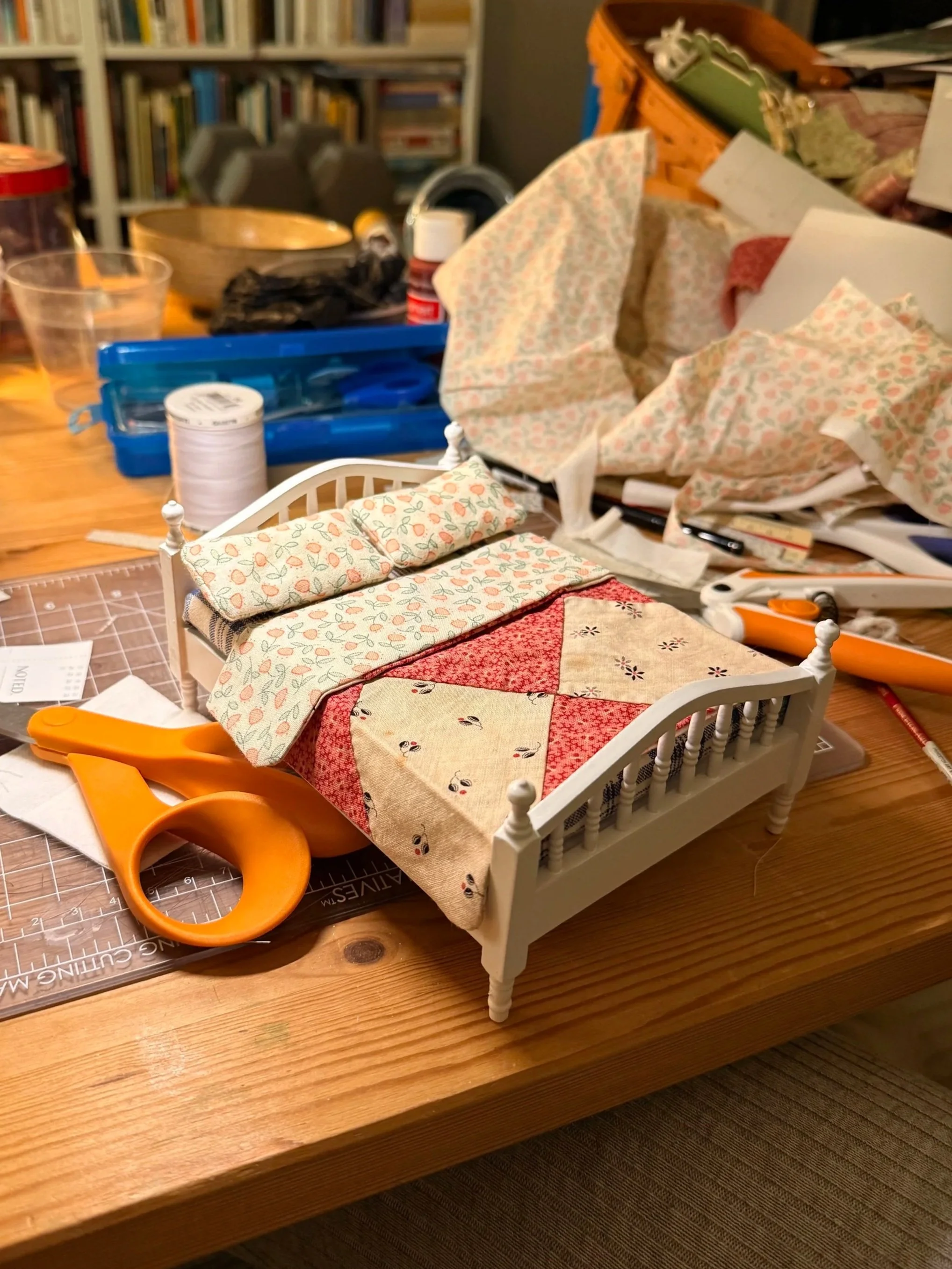 The quilt for the bed was made from an old quilt square that I found at a salvage store years ago (along with the rest of the fabric that I used in this project.) The quilt and pillows were sewn, and the pillows stuffed with tissue.