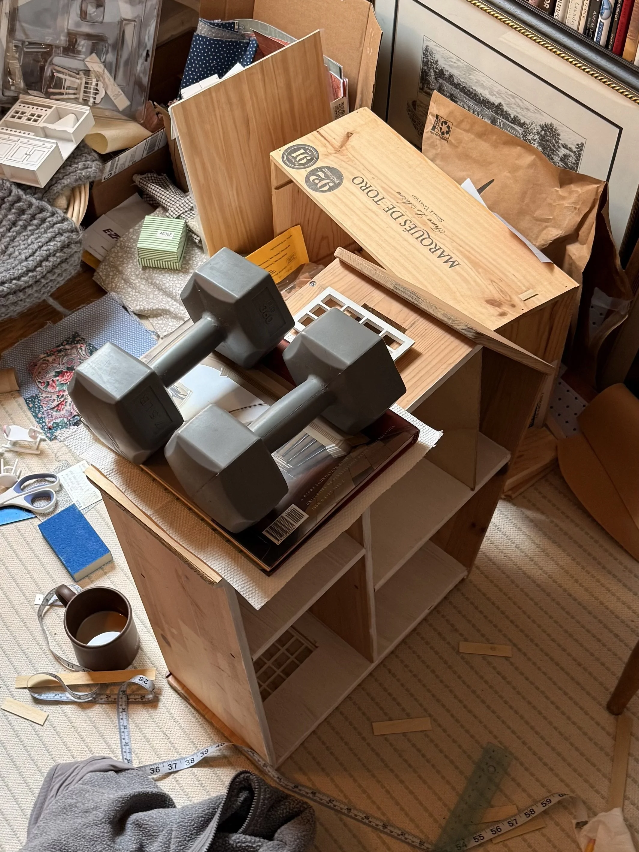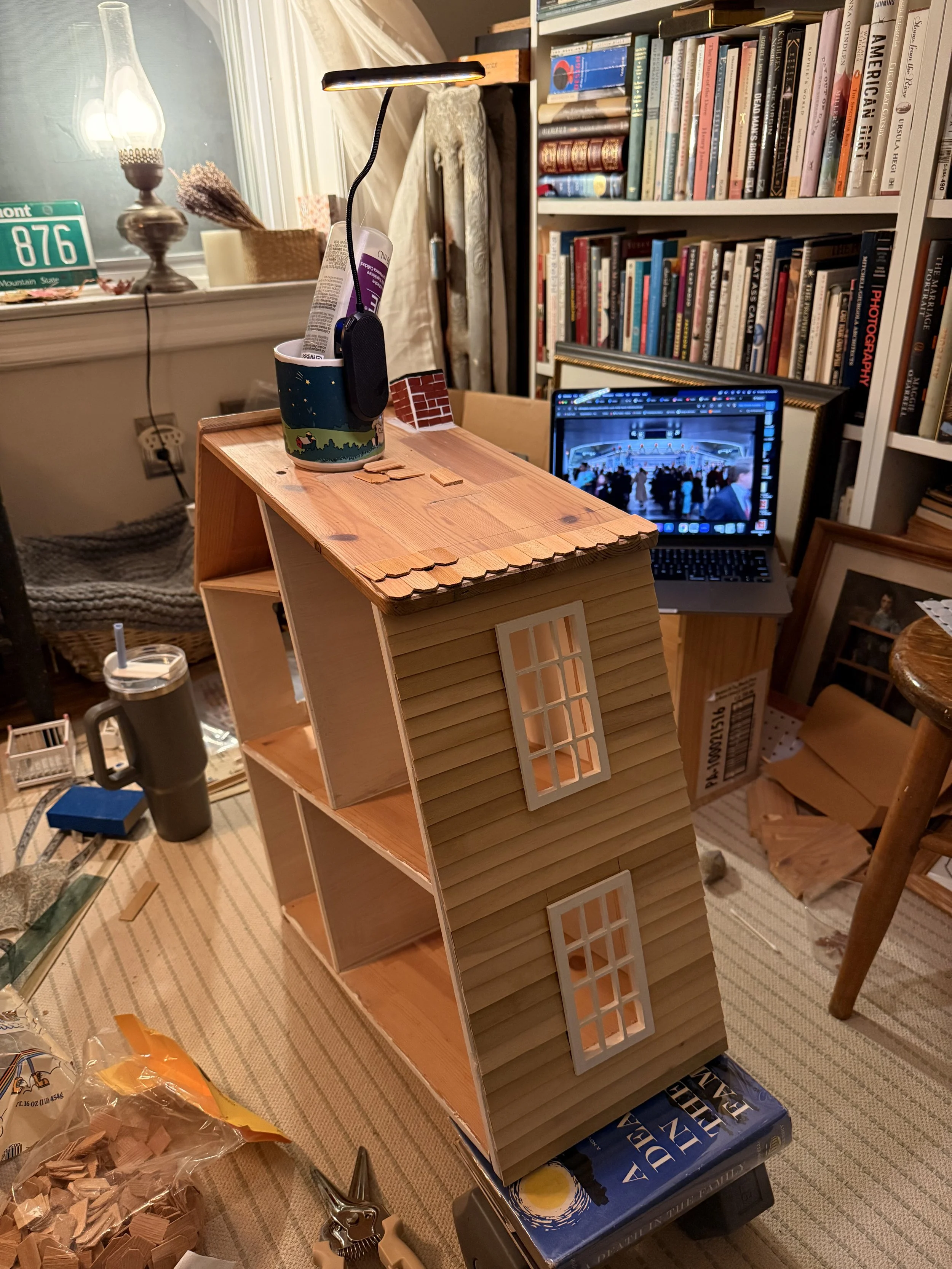 I had to prop the house up to make the roof level to apply the shingles, as I quickly realized that they would slide off ever so slightly while the glue was drying due to gravity. A book on top of one of my weights worked well. This was a time consuming process but very easy, the shingles were easy to trim if needed and I had plenty of supply for the whole roof.