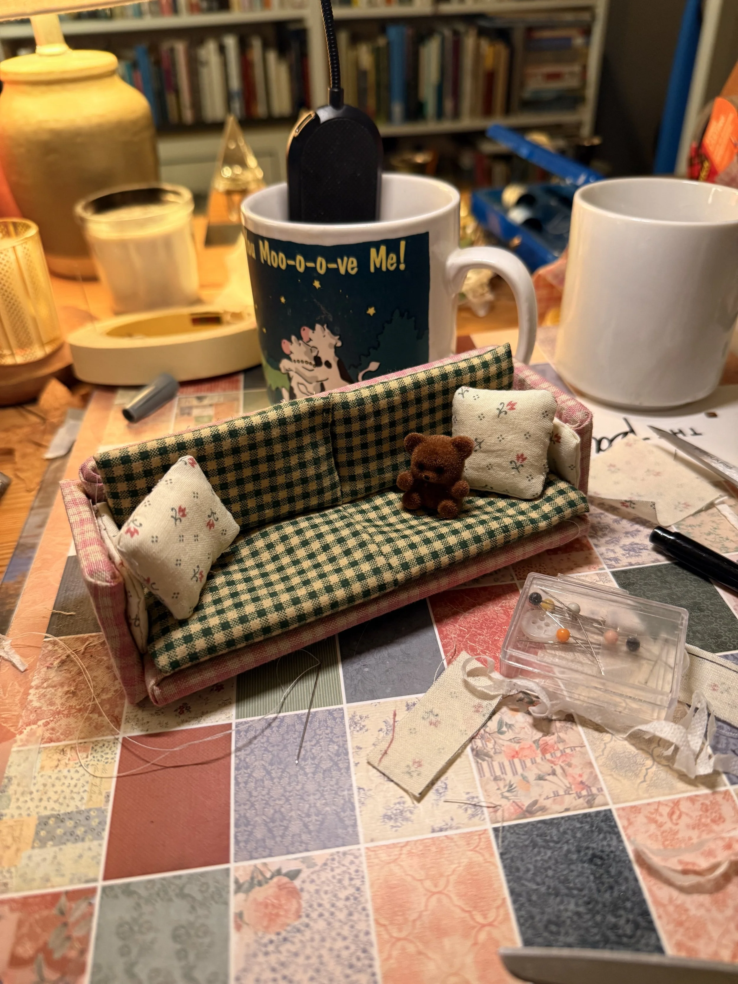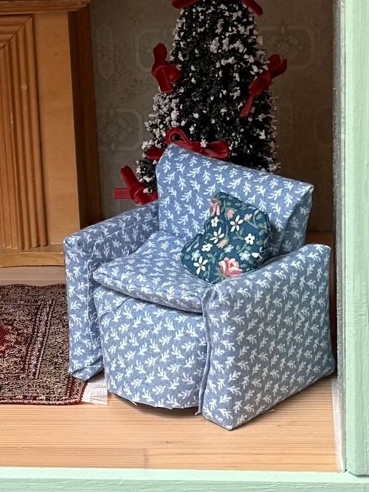 I made the armchair on the day that I completed the house. I consturcted it out of cardboard and used super glue to hold it together. I wrapped the cardboard with tissue to create an upholstered look and then wrapped the fabric around the form, securing it all with tacky glue. The throw pillow was sewn and stuffed with tissue.